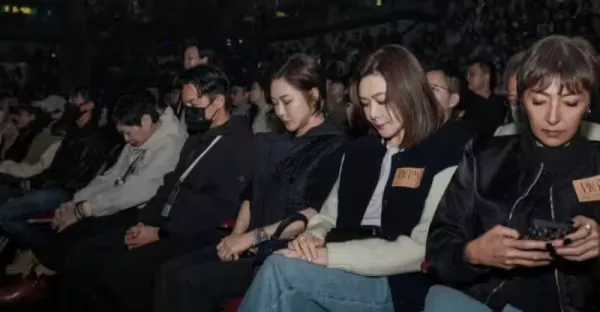 關之琳看演出為火災默哀,低頭坐著表情凝重,上山詩鈉在旁看手機