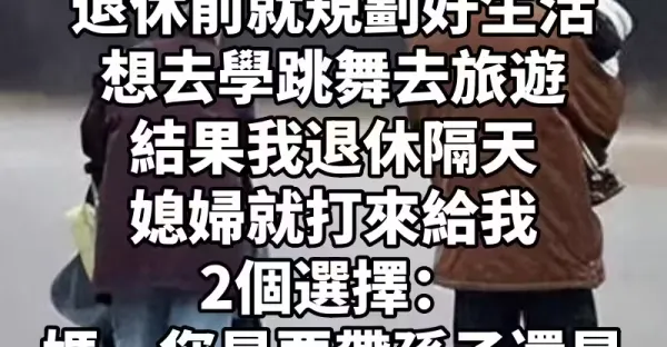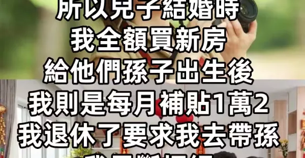 「我超期待退休!退休前我就規劃好生活,想去學跳舞、去旅遊,結果我退休隔天媳婦就打來給我2個選擇:『媽,您是要帶孫子,還是每月給我1萬8退休金?』」 #接下來兒子出聲了