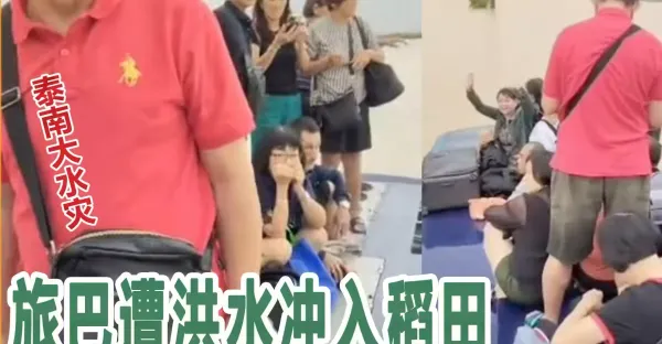 泰南大水災 旅巴遭洪水沖入稻田 21大馬人破窗爬車頂逃生